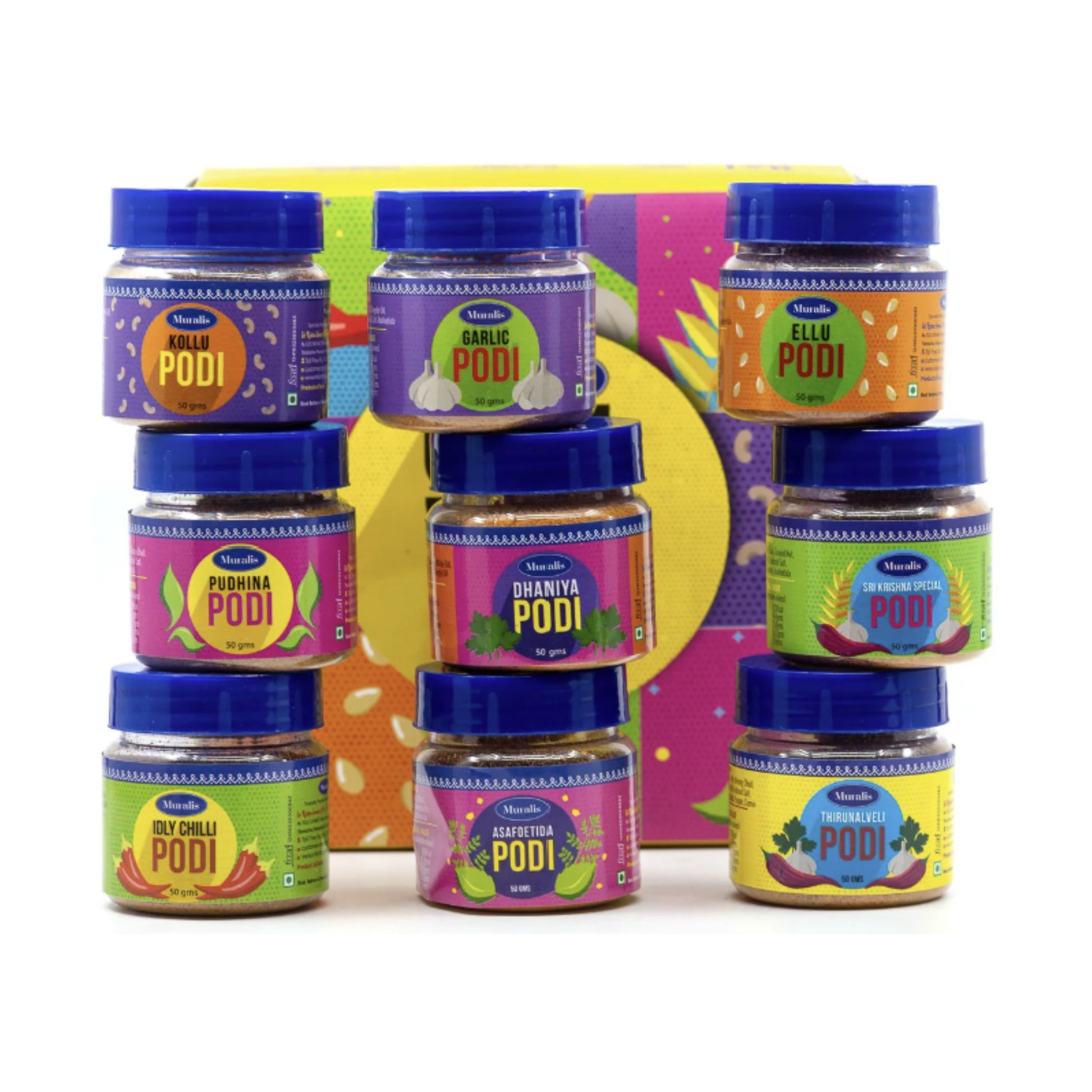 Our aromatic combo is packed with all of your favorite traditional Podis! From Kolu Podi to Garlic Podi, Ellu Podi, Asafoetida Podi, Idly Chili Podi & more authentic minis, we have one for each meal.