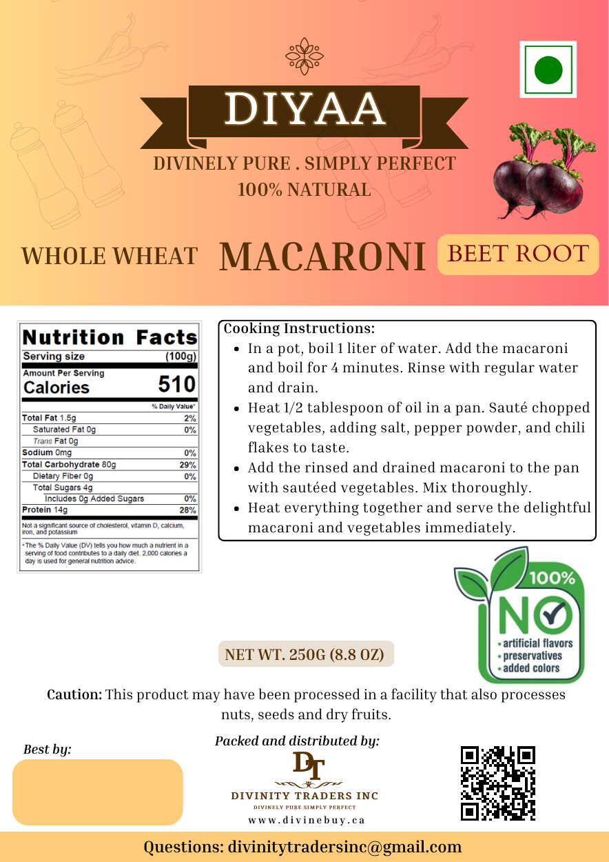 - Diyaa's Beetroot Macaroni made from nutritious organic Beetroot, offers a healthy and delicious option for your next meal.