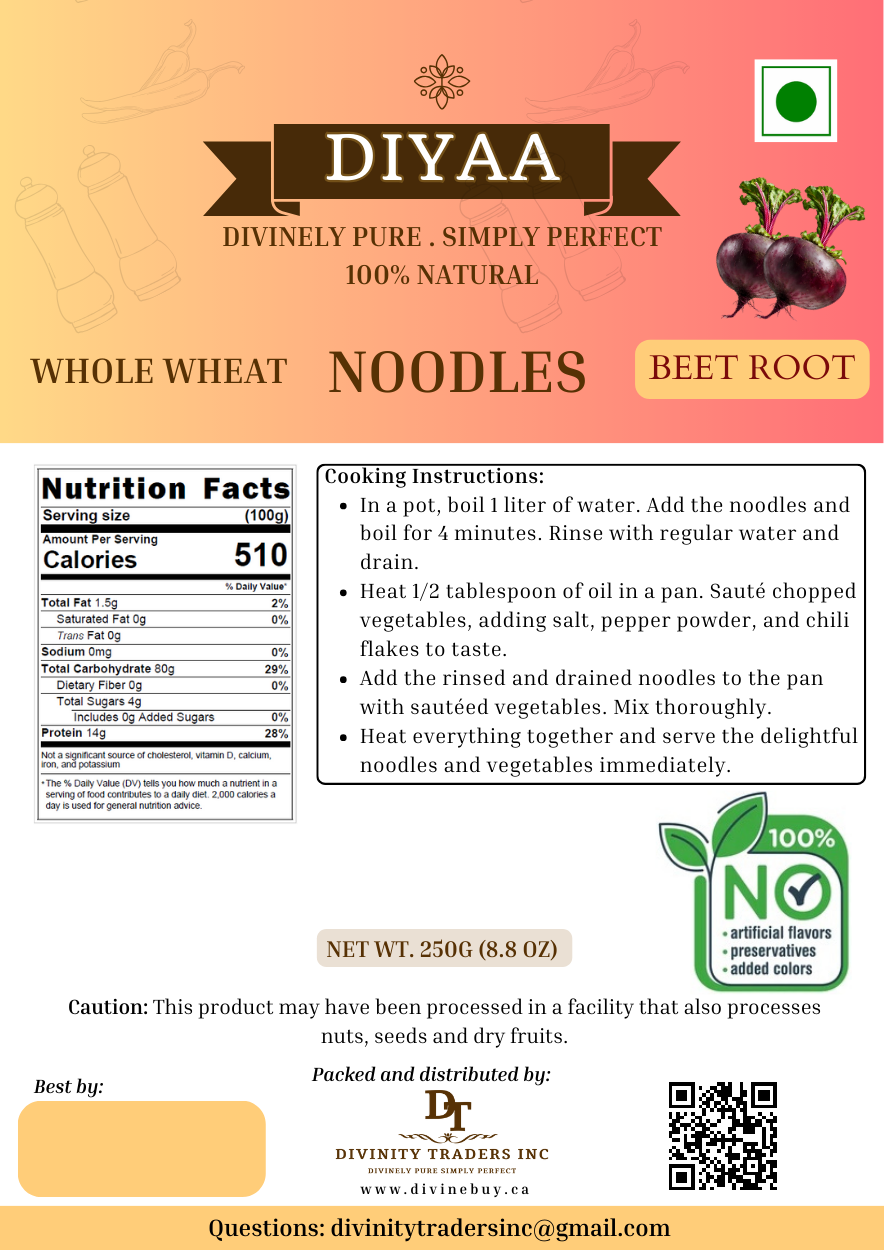 - Diyaa's Beetroot Noodles made from nutritious organic Beetroot, offers a healthy and delicious option for your next meal.