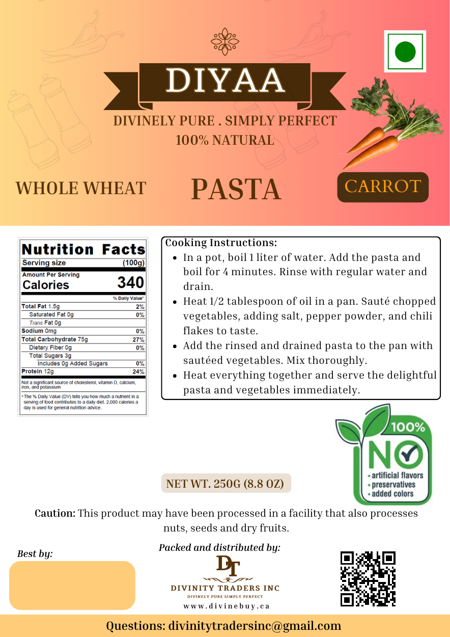 - Diyaa's Carrot Pasta made from nutritious organic Carrot, offers a healthy and delicious option for your next meal.