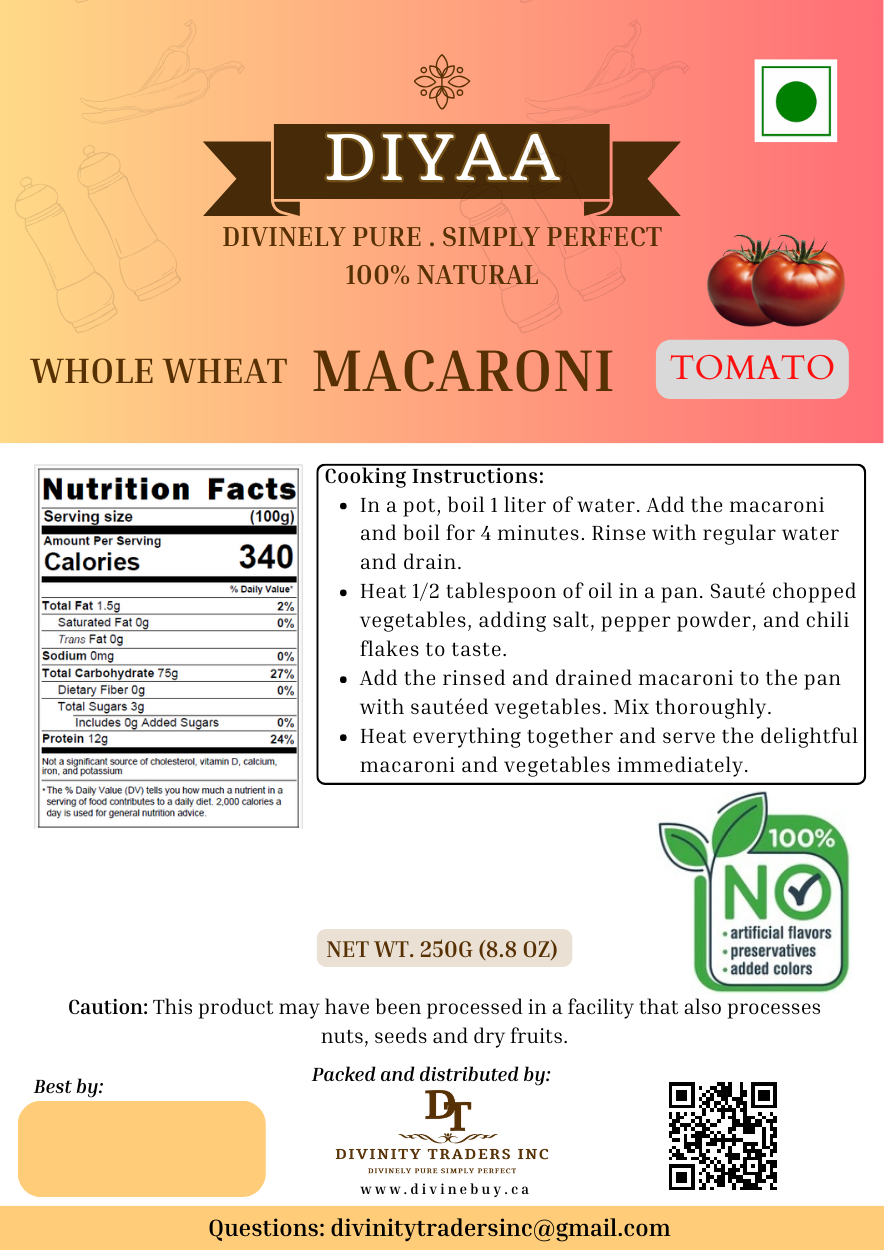 - Diyaa's Tomato Macaroni made from nutritious organic Tomato, offers a healthy and delicious option for your next meal.