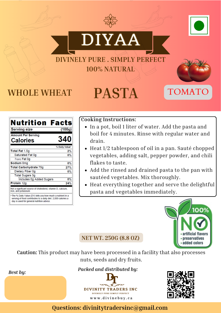 - Diyaa's Tomato Pasta made from nutritious organic Tomato, offers a healthy and delicious option for your next meal.